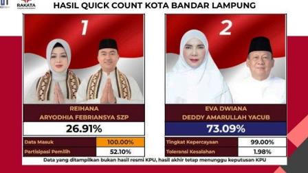 KRAKATOA.ID, BANDARLAMPUNG — Pasangan calon Walikota dan Wakil Walikota Bandar Lampung, Eva Dwiana – Deddy Amarullah, tampaknya akan kembali memimpin Kota Bandar Lampung periode 2025-2030. Berdasarkan hasil quick count dari beberapa lembaga survei, pasangan incumbent ini sementara unggul dalam perhitungan suara Pilkada Serentak yang dilaksanakan pada Rabu, 27 November 2024 kemarin.