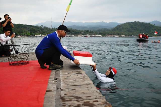 KRAKATOA.ID, PESAWARAN – Laut Mutun pagi itu tak sekadar menggulungkan ombaknya. Ia menjadi saksi, tempat bendera merah putih berkibar gagah di atas permukaannya—dan seorang perempuan, sendirian di antara para pria, berenang teguh membawa baki, membawa Sang Saka Merah Putih.