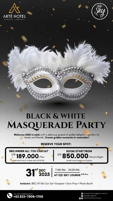 KRAKATOA.ID, BANDAR LAMPUNG -— Dalam rangka menyambut pergantian Tahun Baru 2026, Arté Hotel Bandar Lampung menghadirkan BBQ Dinner dengan tema “Black & White Masquerade Party” yang akan diselenggarakan pada Rabu, 31 Desember 2025, mulai pukul 19.00 hingga 22.00 WIB, bertempat di iZZi Sky Lounge, lantai 17.