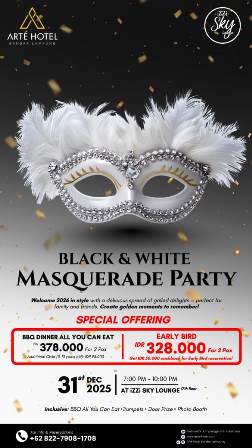 KRAKATOA.ID, BANDAR LAMPUNG -— Dalam rangka menyambut pergantian Tahun Baru 2026, Arté Hotel Bandar Lampung menghadirkan BBQ Dinner dengan tema “Black & White Masquerade Party” yang akan diselenggarakan pada Rabu, 31 Desember 2025, mulai pukul 19.00 hingga 22.00 WIB, bertempat di iZZi Sky Lounge, lantai 17.